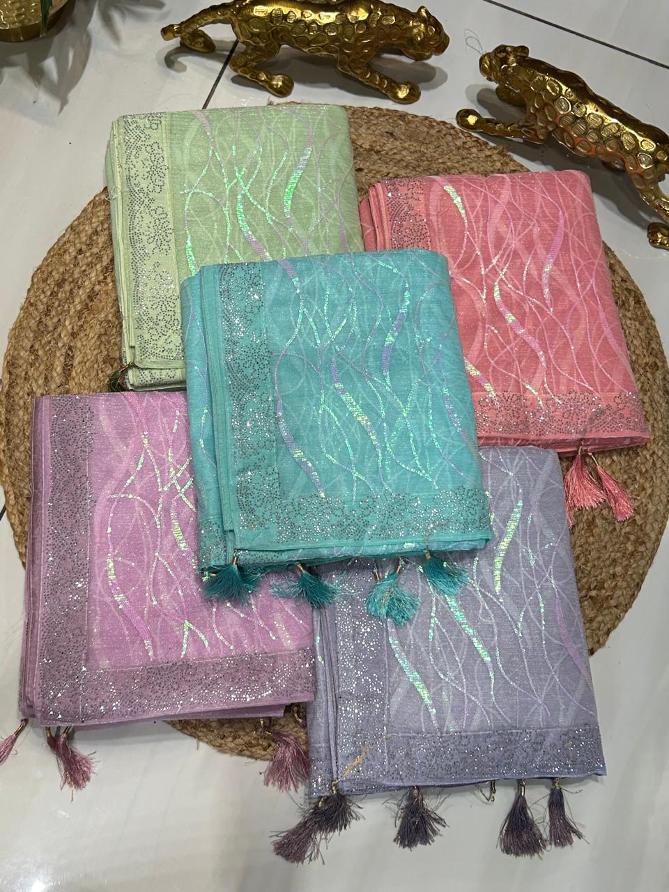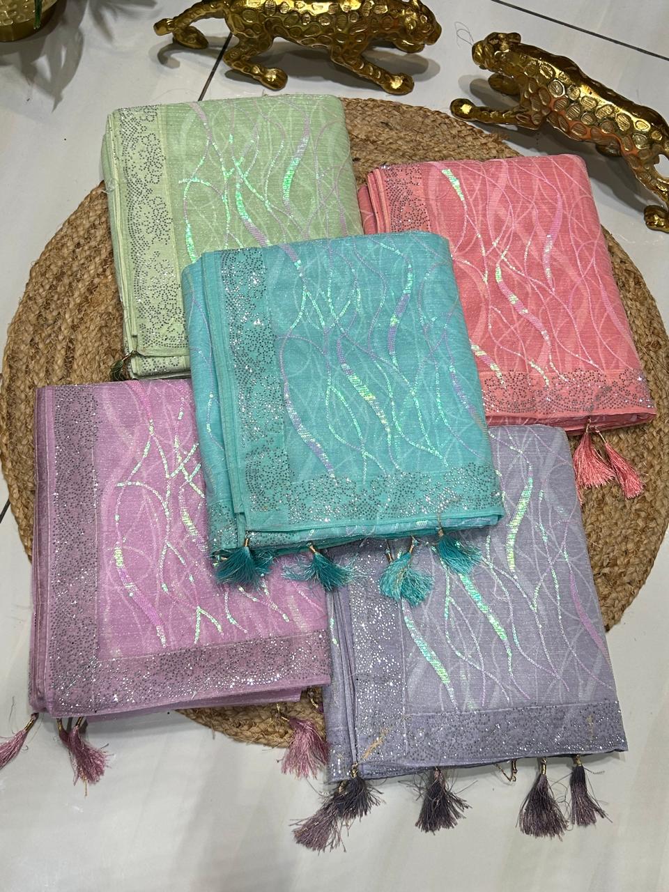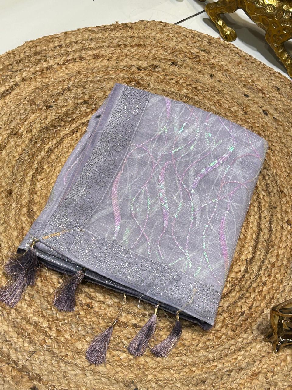 soft organza saree, crafted with all-over shiny wavy line sequins work that adds a luminous charm. The rich border detailing and playful tassel pallu make it an elegant pick for modern celebrations.