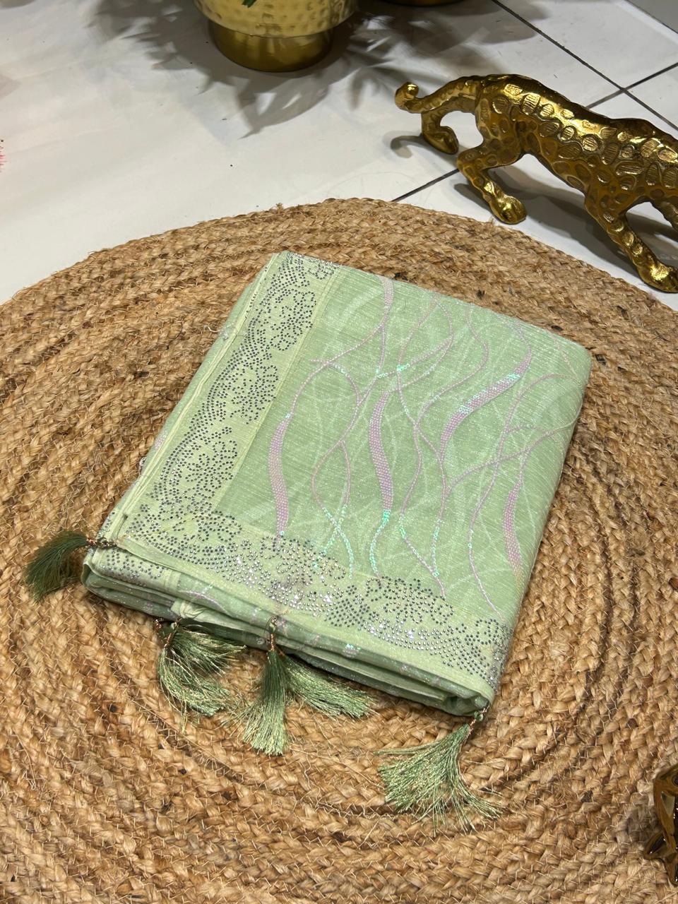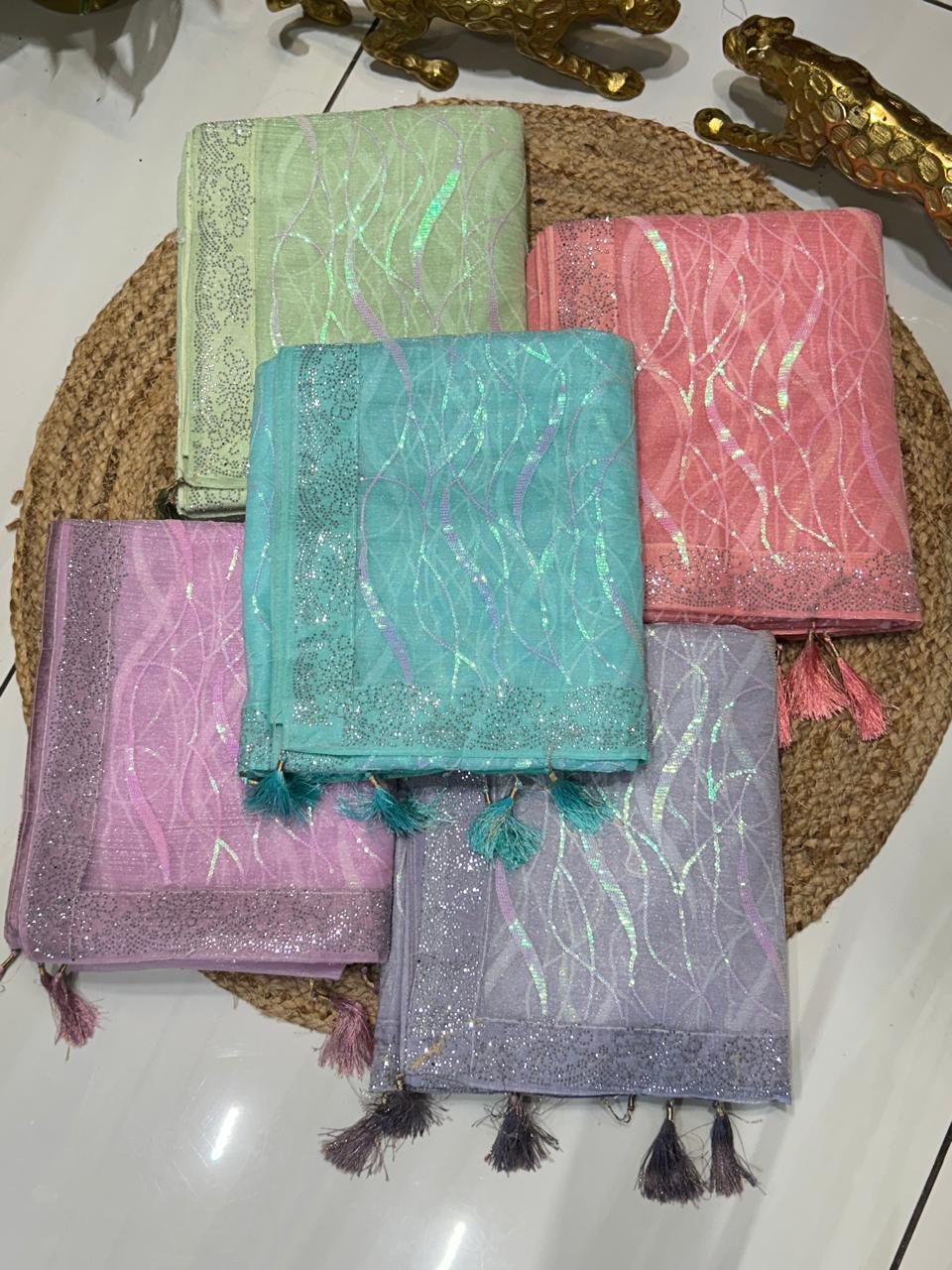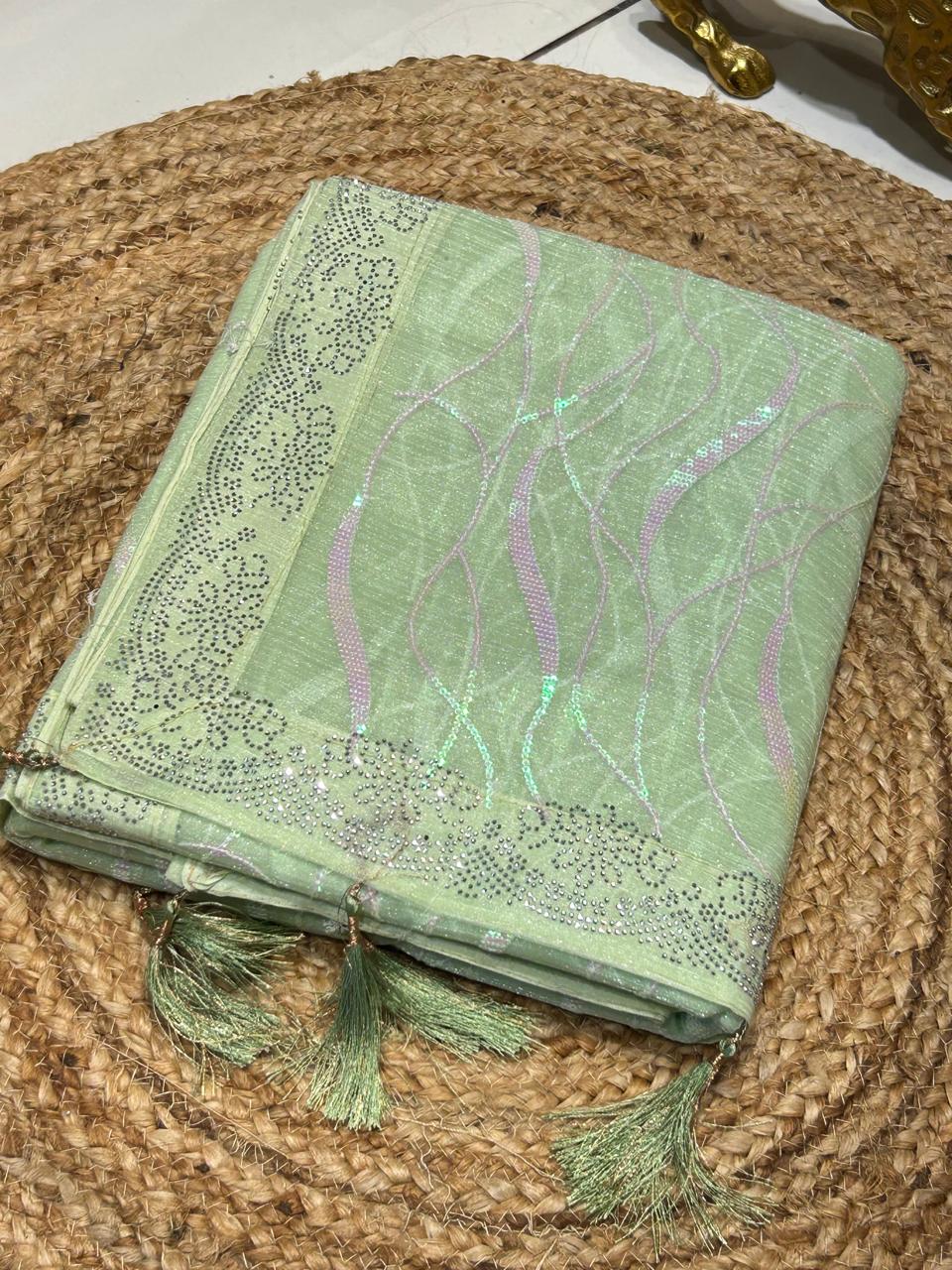 soft organza saree, crafted with all-over shiny wavy line sequins work that adds a luminous charm. The rich border detailing and playful tassel pallu make it an elegant pick for modern celebrations.